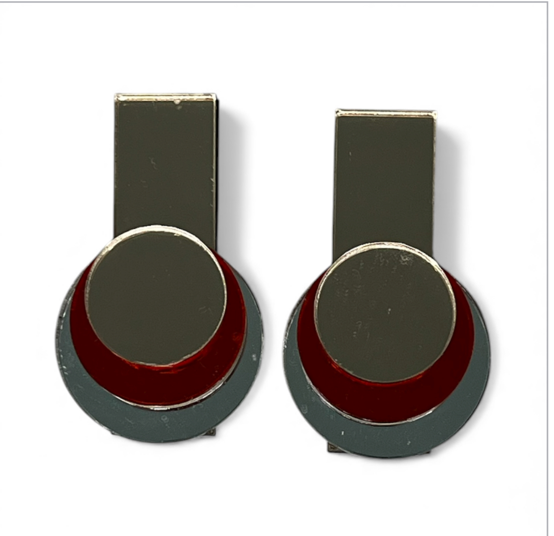 Colores: ro rosado, naranja, plata espejo con base negro mate. Todo metacrilato.
